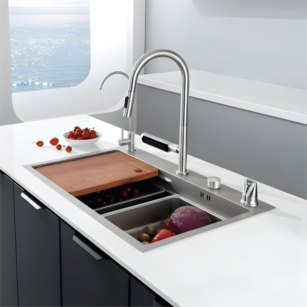 Entegre kesme ve yıkama ünitesi, gıda hazırlık sürecini tek bir merkezde toplar. Evye üzerine tam uyum sağlayan kesme tahtası ve süzgeçli yıkama haznesi sayesinde, tezgah üzerindeki dağınıklık önlenir ve hijyenik bir çalışma alanı oluşturulur.