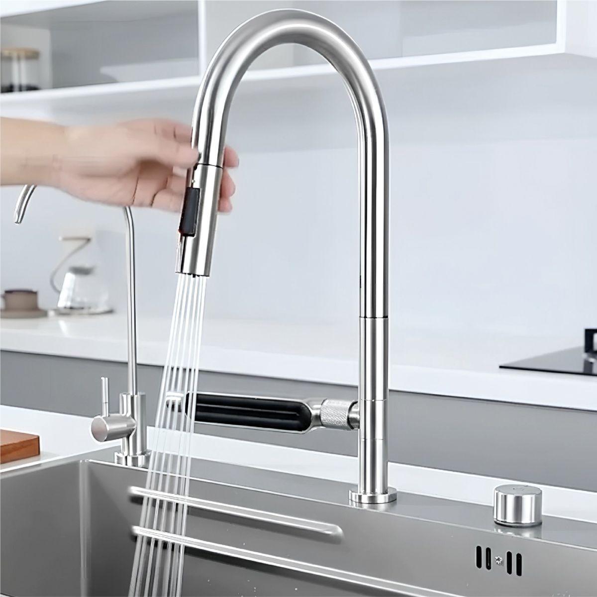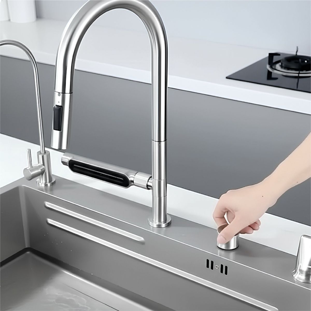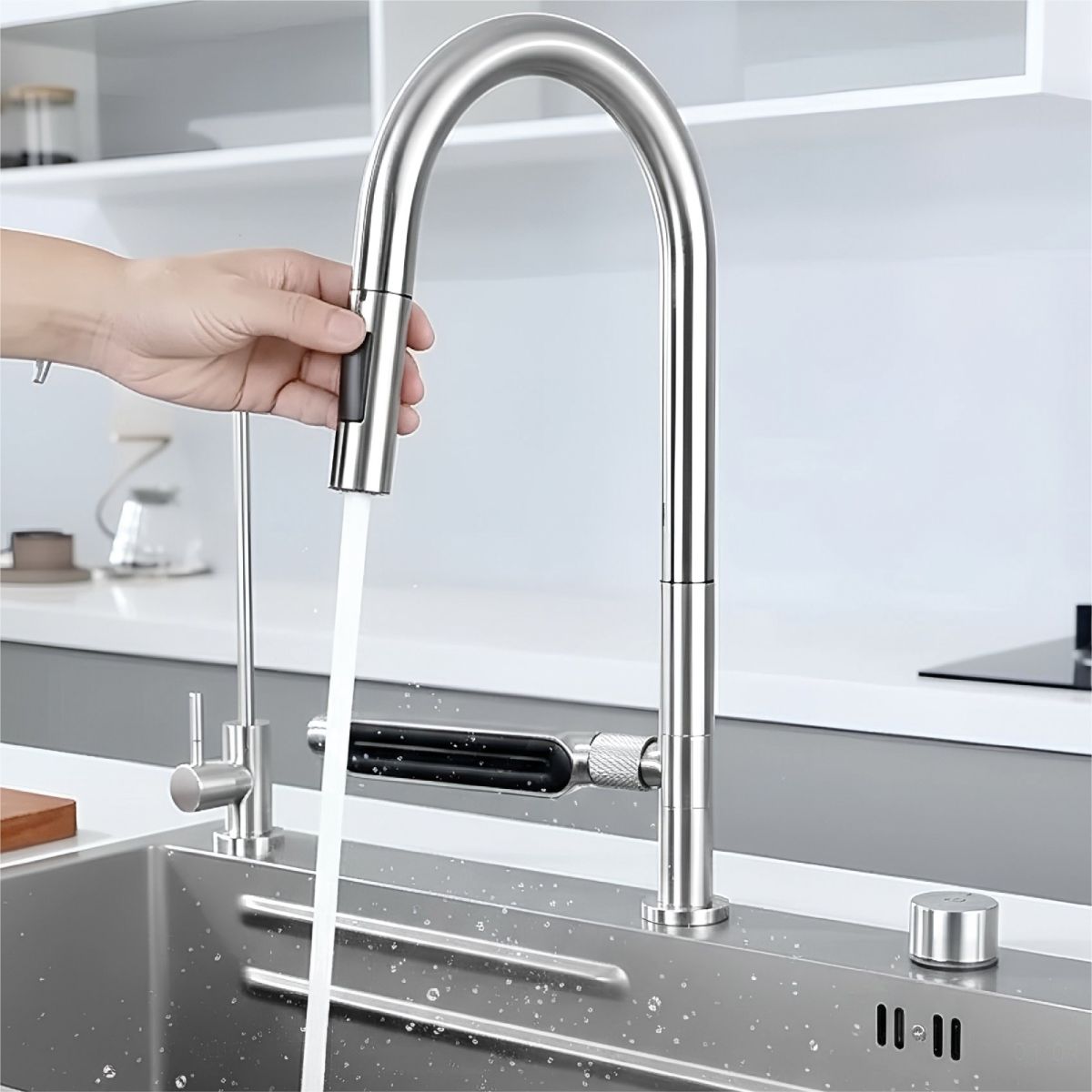 Evye bataryası, üç farklı akış moduna sahiptir: Köpüklü akış, tazyikli akış ve geniş püskürtme. Uzayan spiralli başlık yapısı, evye haznesinin her noktasına erişim imkanı sunarak temizlik işlemlerini hızlandırır ve esnek bir kullanım alanı yaratır.